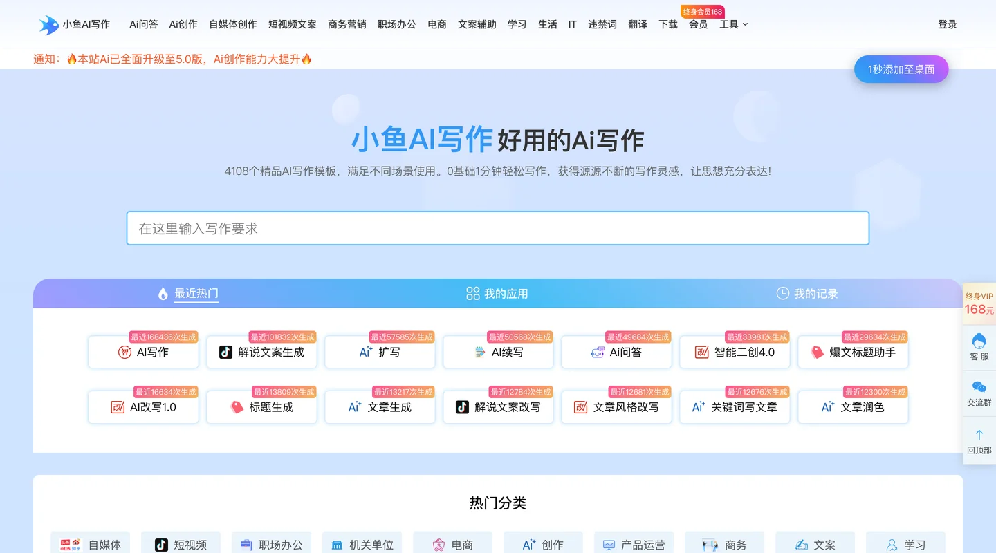 满足自媒体人和办公人写作创作的在线智能AI写作平台,可以用AI自动生成高质量原创内容,内容创作覆盖多种类型,满足不同场景、人群的AI创作需求以及提供个性化的自定义应用